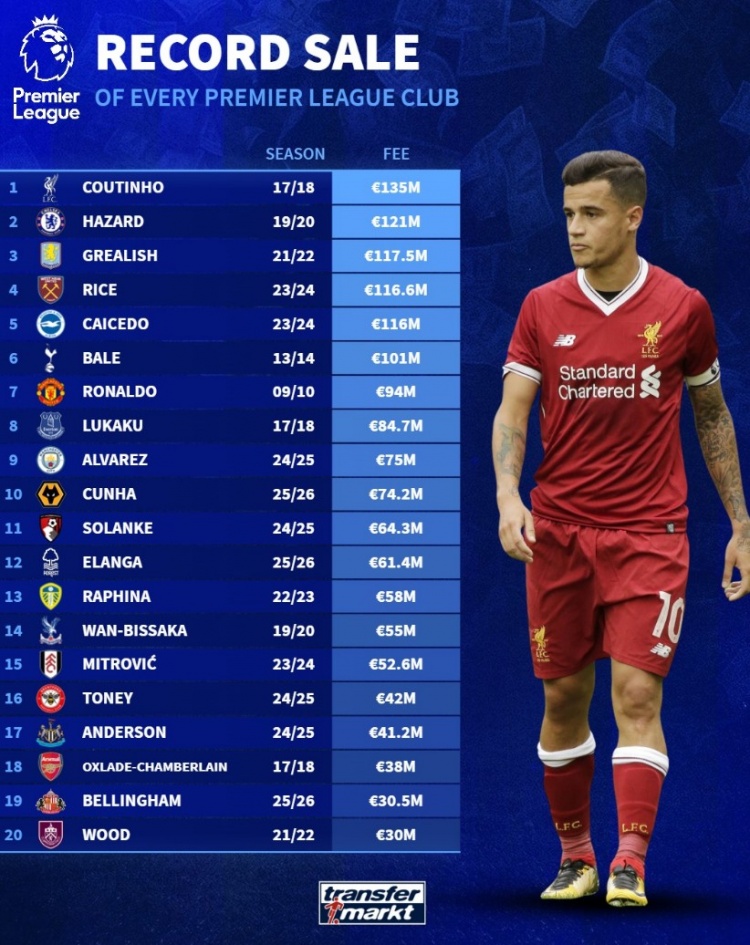 7月18日讯 德转盘点了英超目前20支球队队史卖人最贵榜单,其中库蒂尼奥、阿扎尔等球员在列,具体如下: